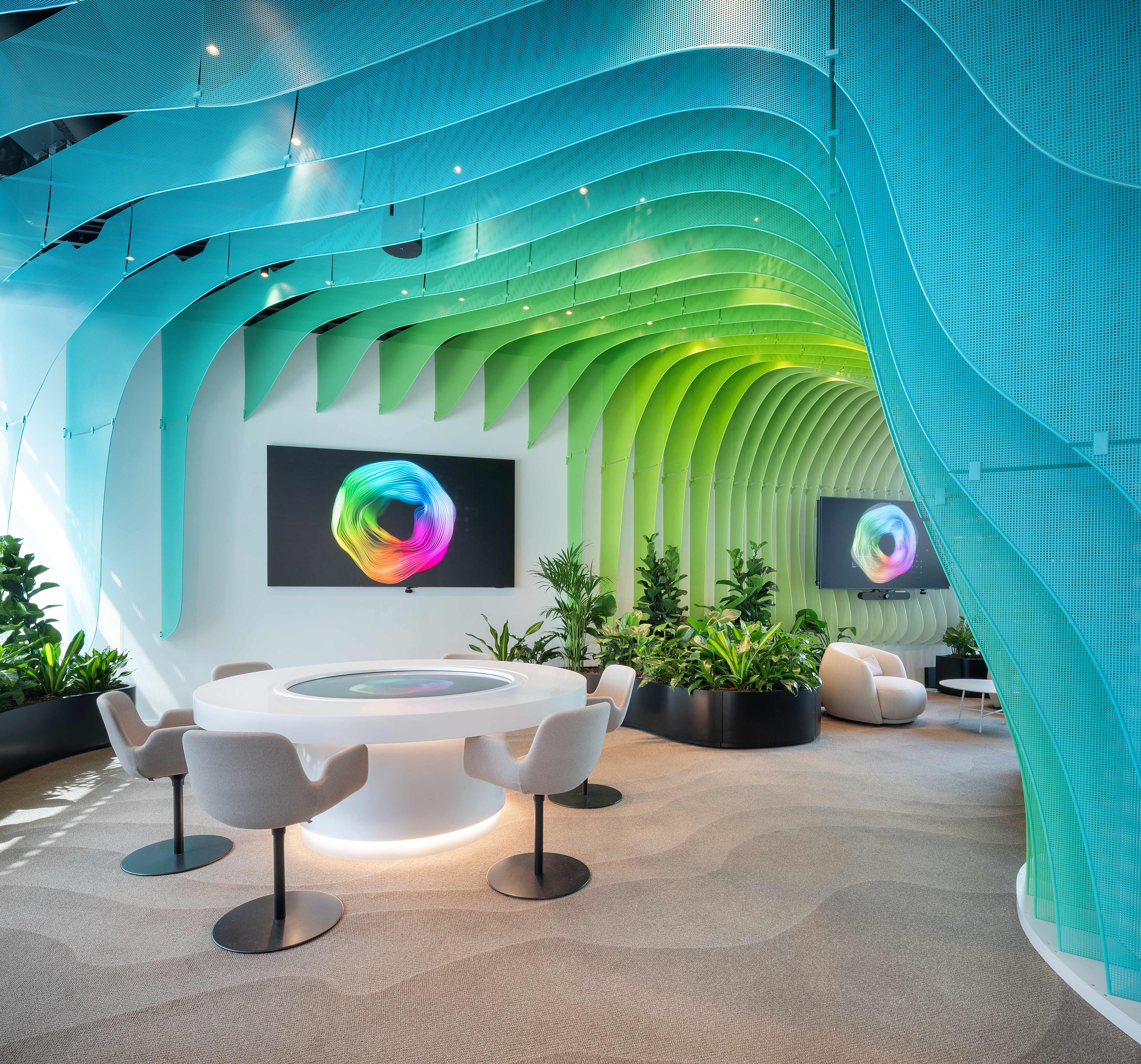 Si tratta di un progetto di Design computazionale, dove la forma è stata modellata tramite algoritmi generativi elaborati da Lombardini22. In questo modo si è potuto sviluppare una geometria organica generale definita da elementi singoli che per forma e colore rimangono coerenti tra loro. Uno spazio da forme complesse, ma armoniche, in cui fin dalle prime fasi in maniera matematica è stata controllata la fattibilità tecnica.